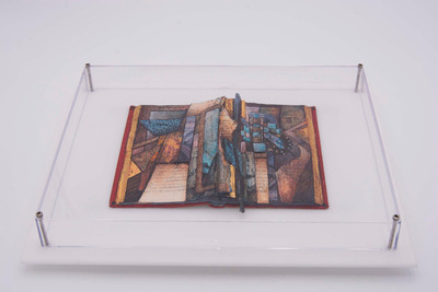 1 book object : color illustration. Altered book, mounted in acrylic case. The pages are sealed together to form a base for construction. Mixed media, collage, and assemblage techniques. Book cover is mounted to the acrylic backing with one rivet in each corner. Title information from back of case. Signed and dated on back. RISD Alumna, gift of the artist. Fleet Library at RISD Alumni Collection. Curated title for Fleet Library Special Collections exhibition Stacked & Altered, summer 2022.