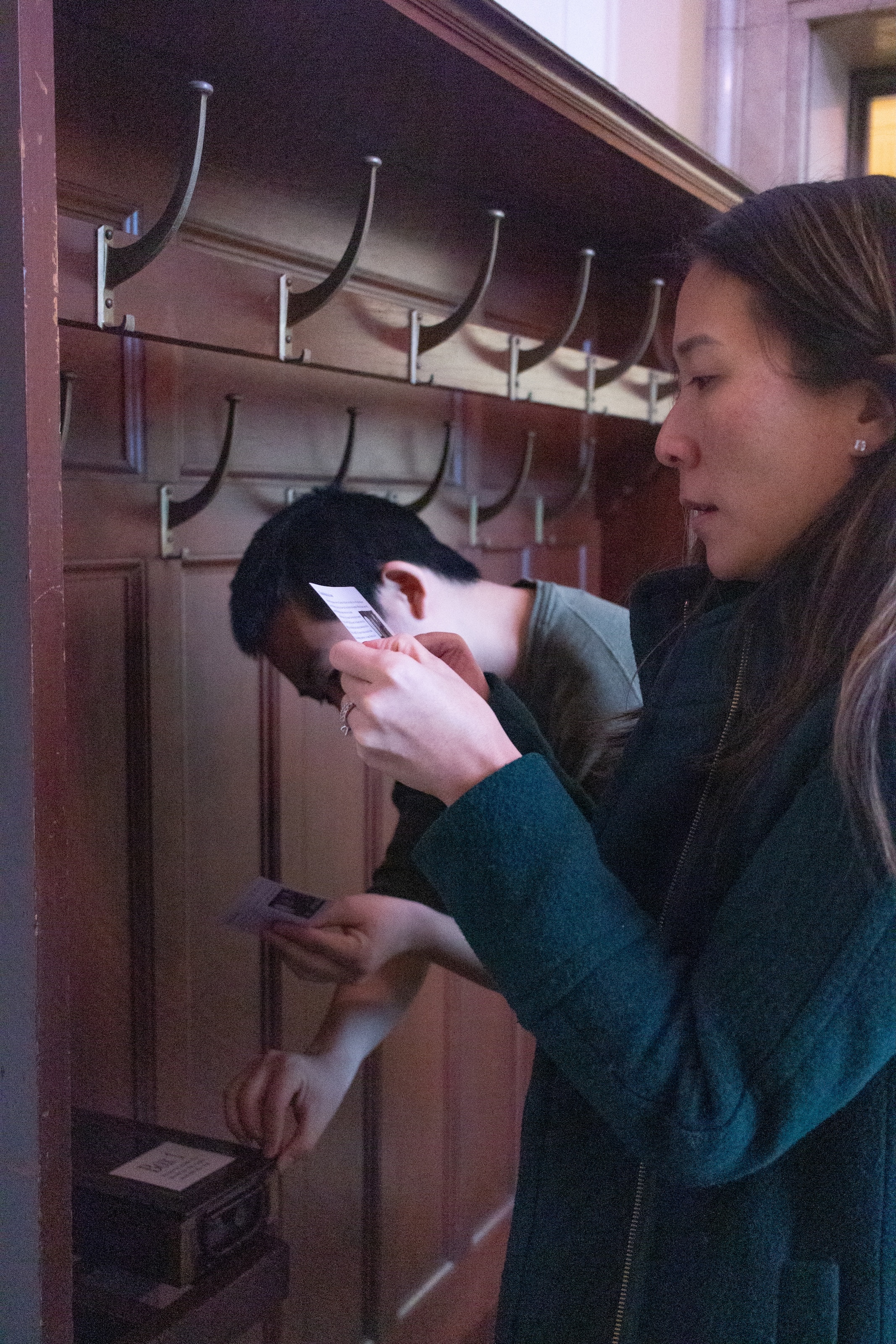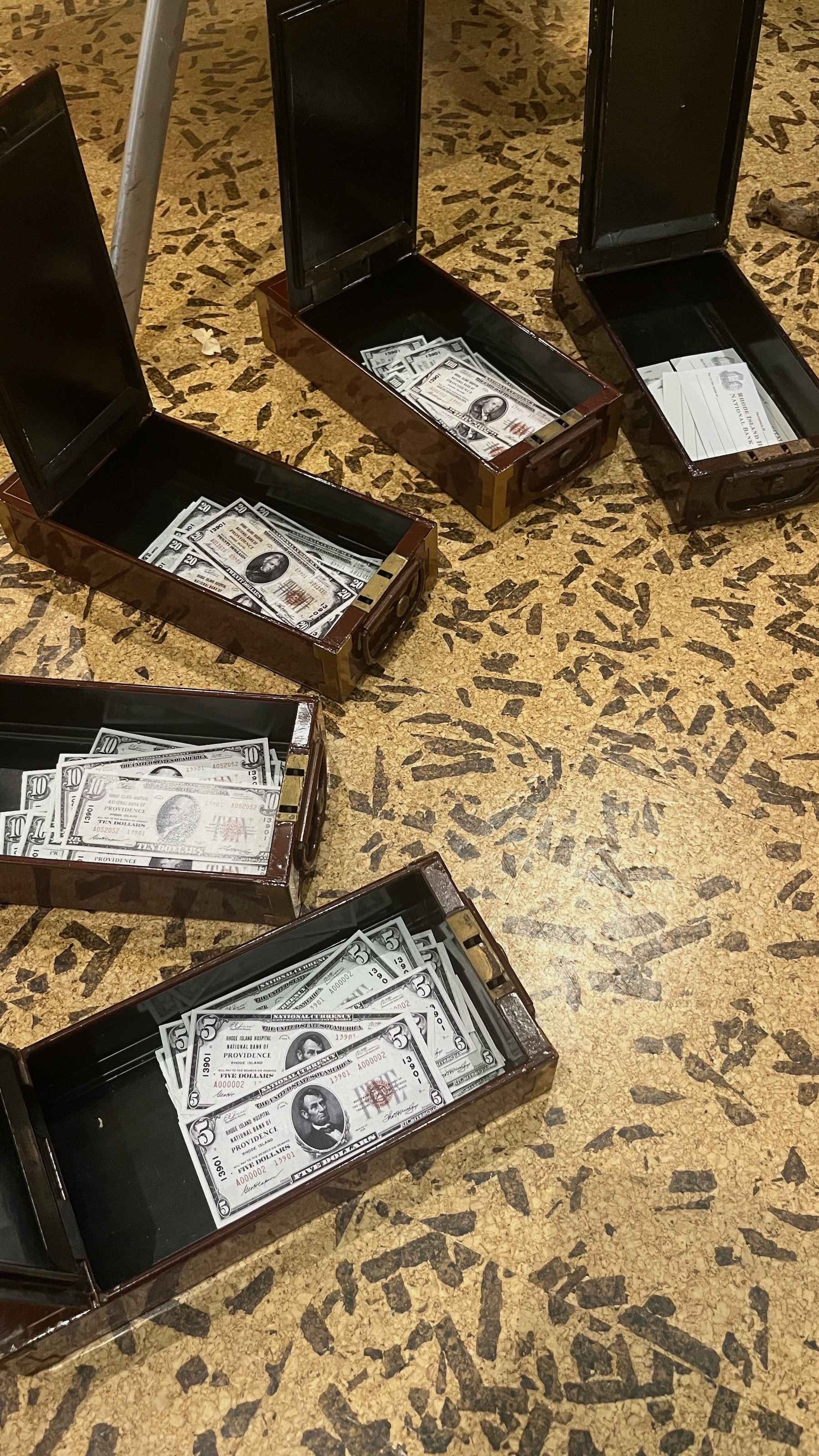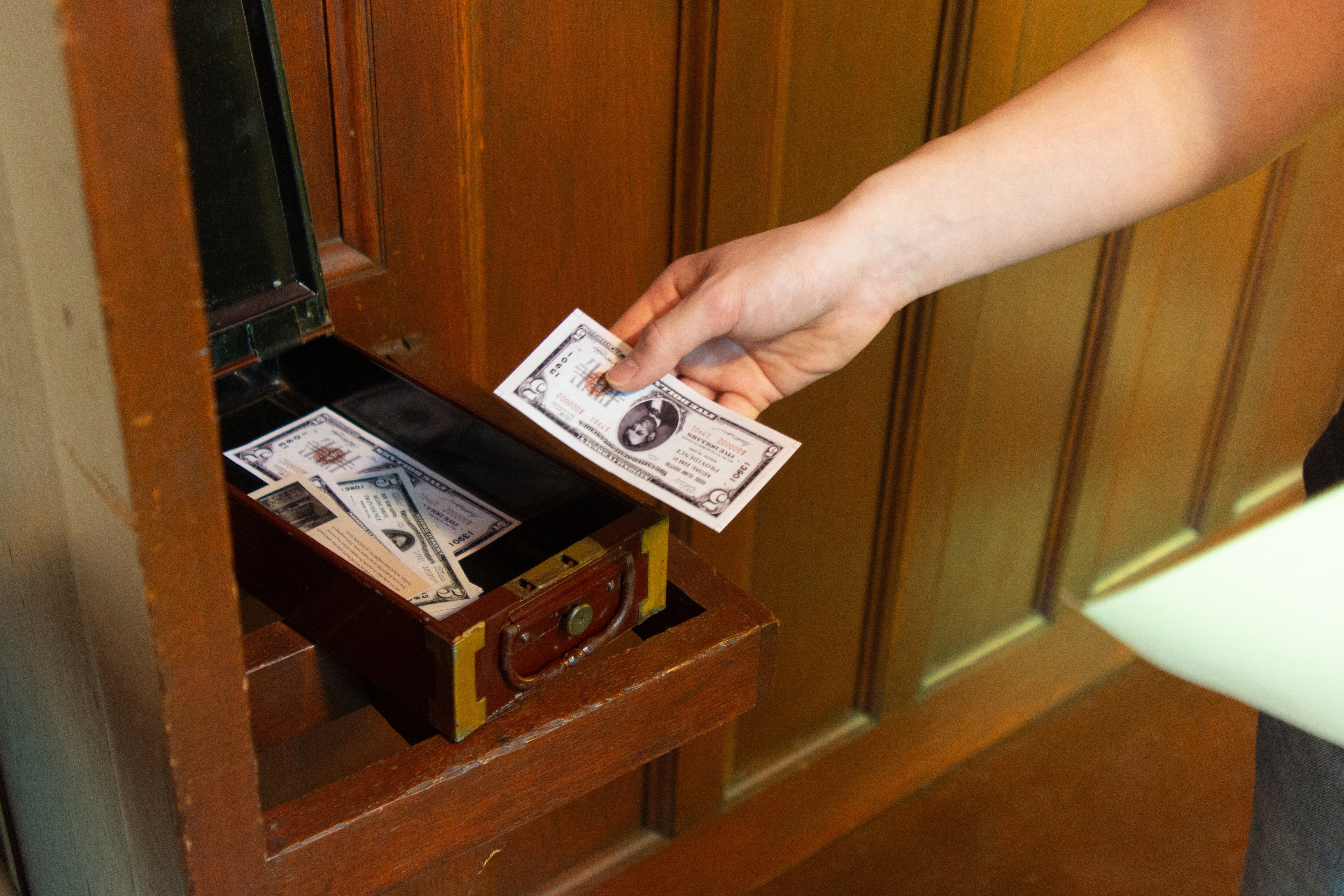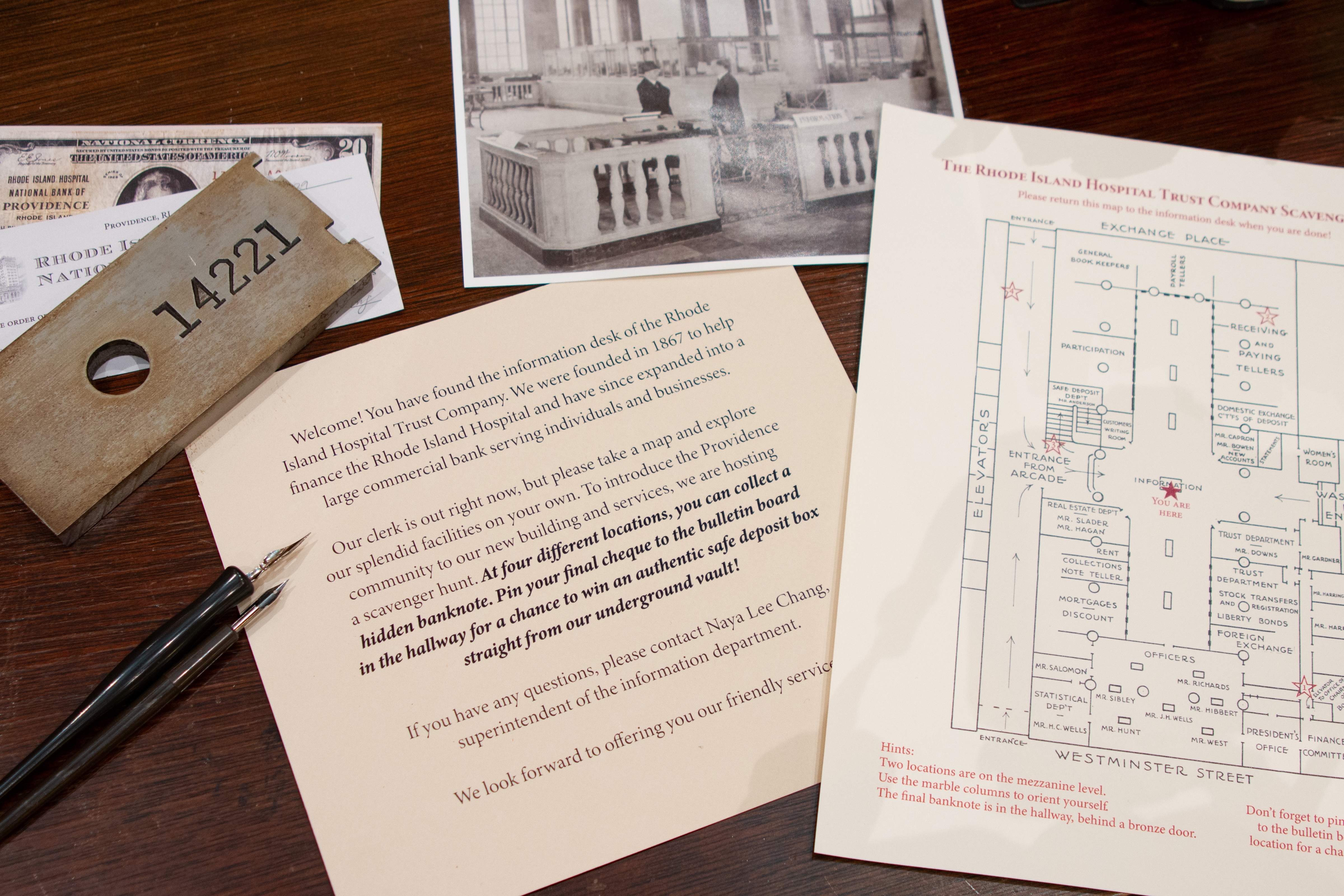 A reception desk recreated from archival photos and placed in its original location drew viewers into the installation. Ephemera on the desk introduced visitors to the function and character of the Rhode Island Hospital Trust Company, and instructions and a map set them on a scavenger hunt. At four different locations, participants collected faux banknotes with information about the company and the building printed on the backs. Those who completed the hunt wrote their name on a blank check to enter a raffle to win an authentic safe deposit box from the vault that still exists in the building’s basement.