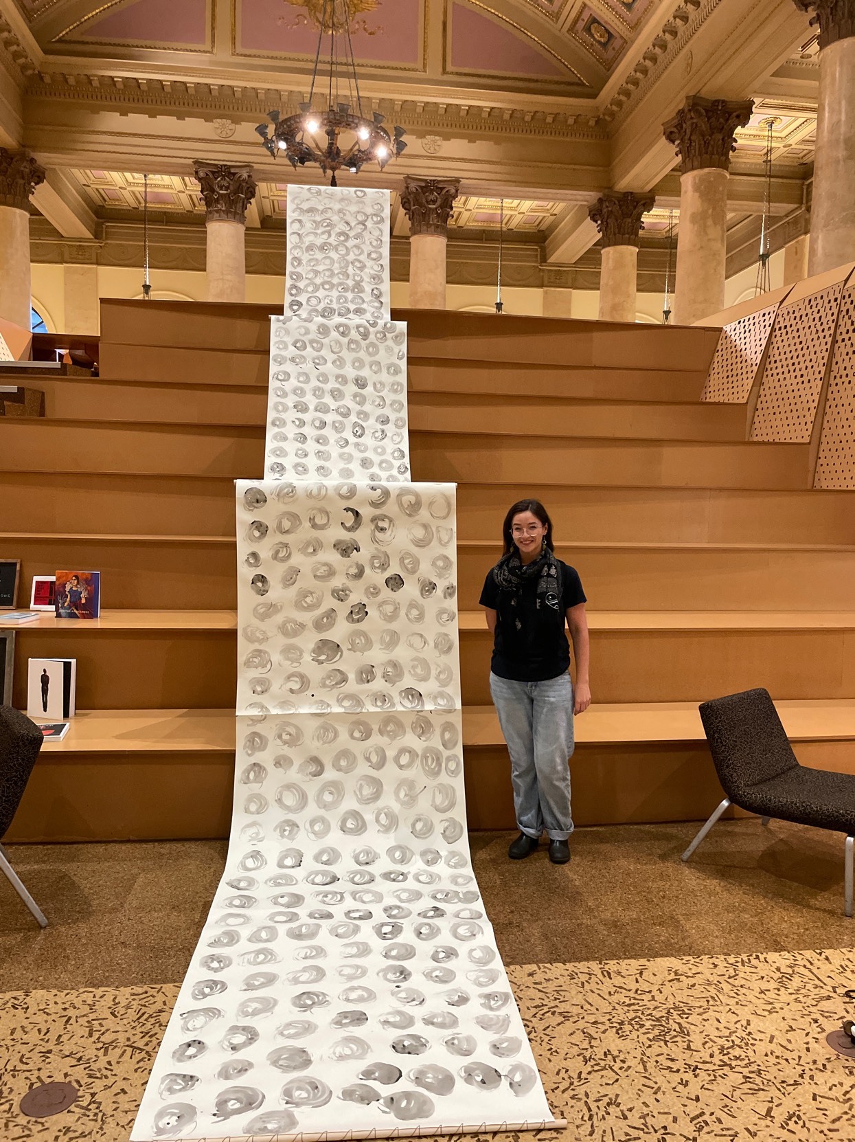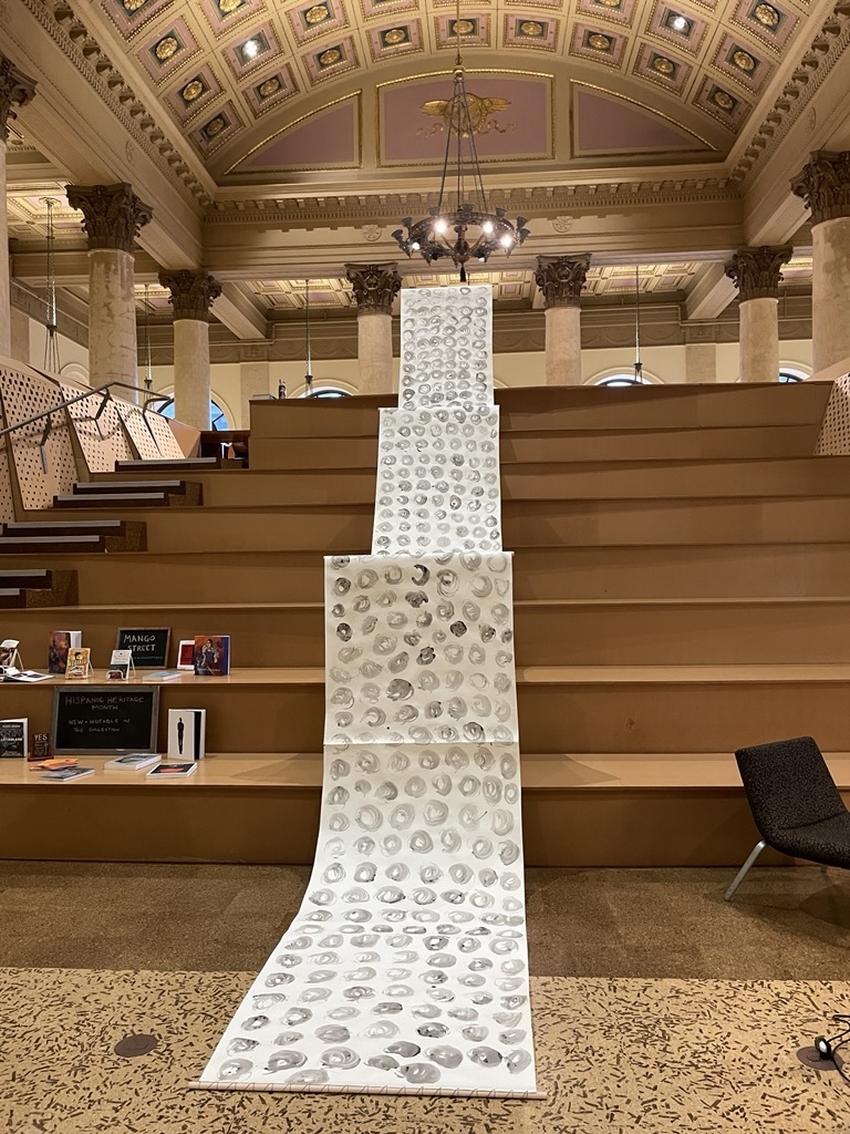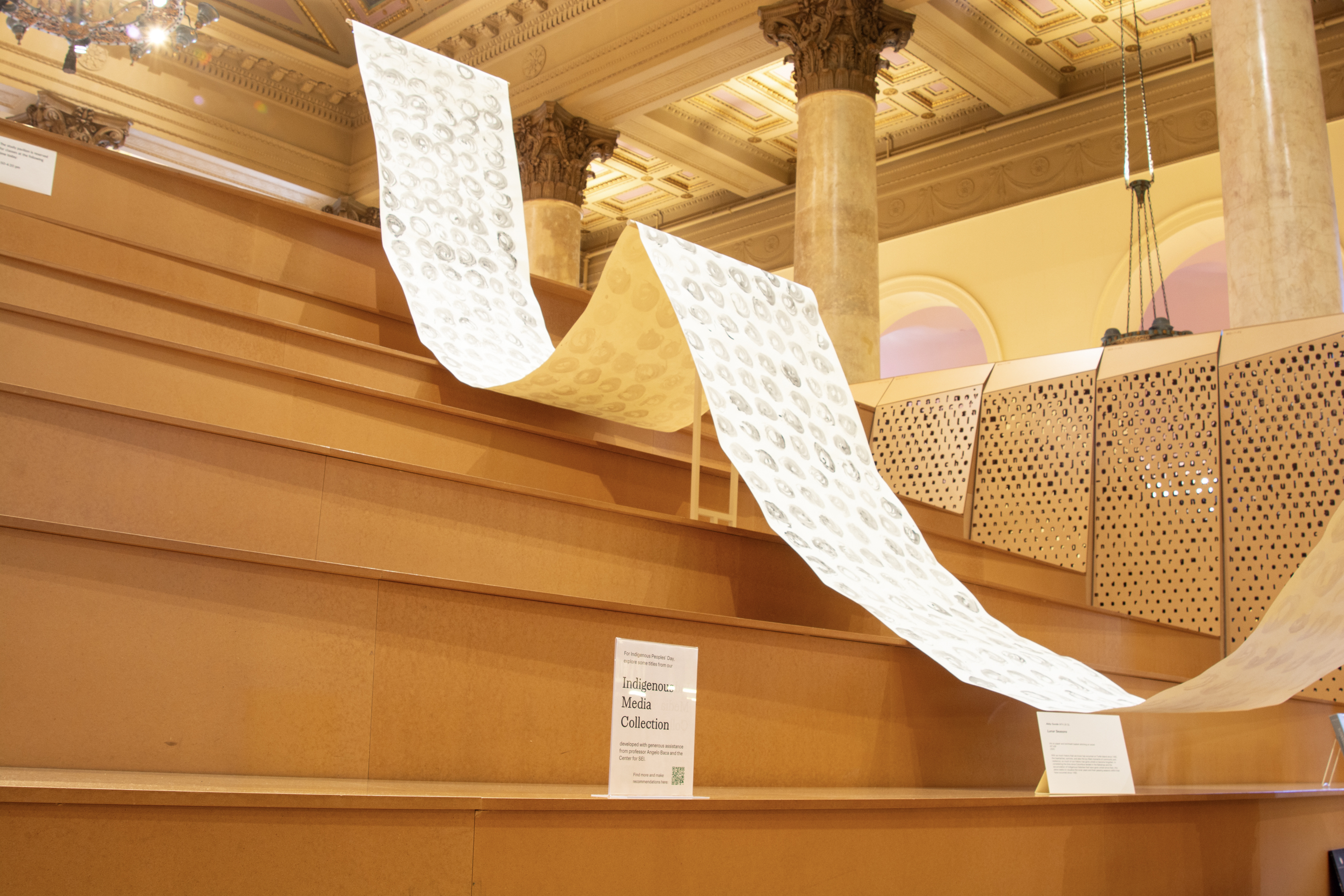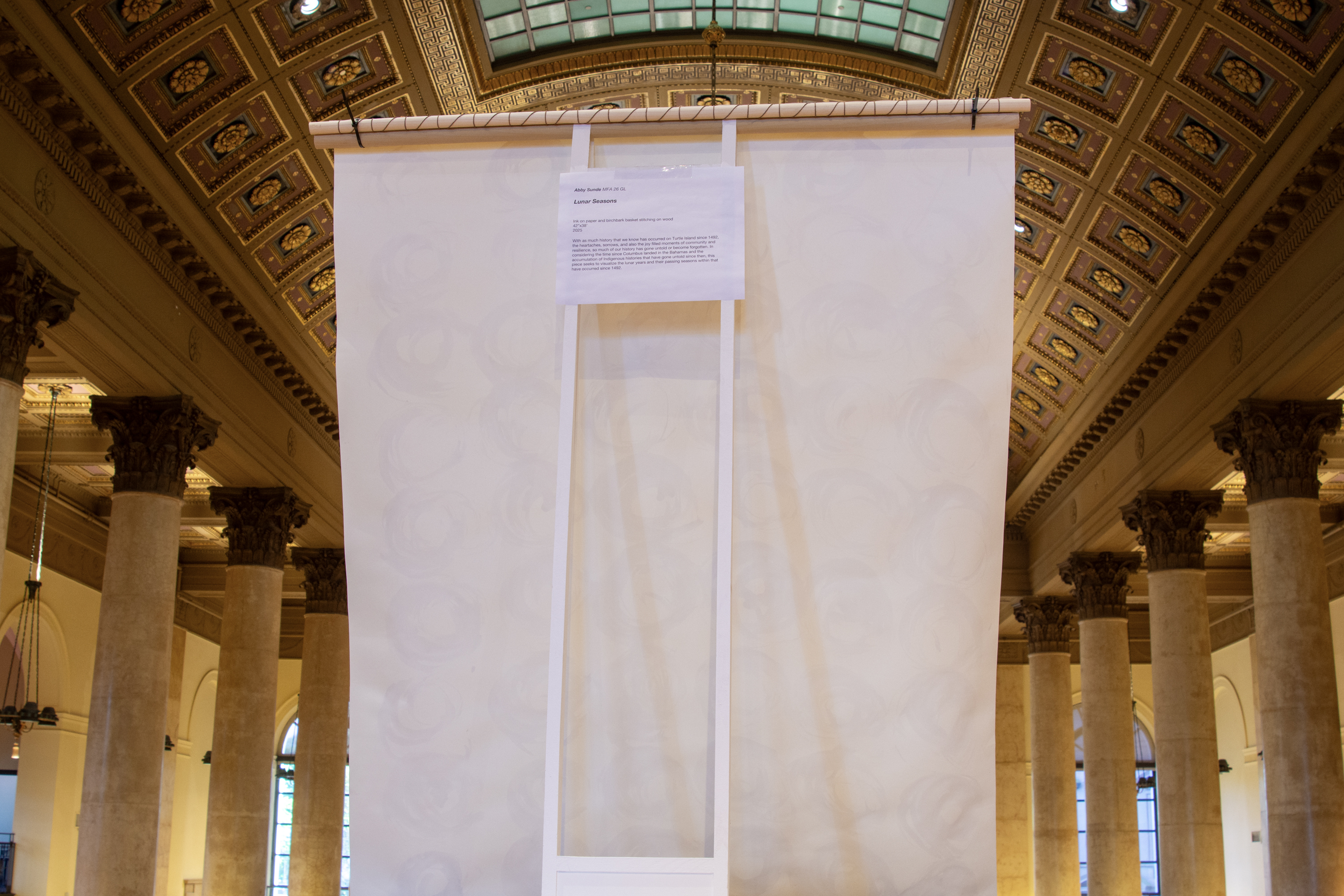Installation by Abby Sunde MFA 26 GL, on view Oct. 8 - Oct. 17, 2025, Fleet Library 1st floor main reading room pavilion, 15 Westminster St., Providence, RI. Ink on paper and birchbark basket stitching on wood 42”x38’, 2025. With as much history that we know has occurred on Turtle Island since 1492, the heartaches, sorrows, and also the joy filled moments of community and resilience, so much of our history has gone untold or become forgotten. In considering the time since Columbus landed in the Bahamas and the accumulation of Indigenous histories that have gone untold since then, this piece seeks to visualize the lunar years and their passing seasons within that have occurred since 1492.
