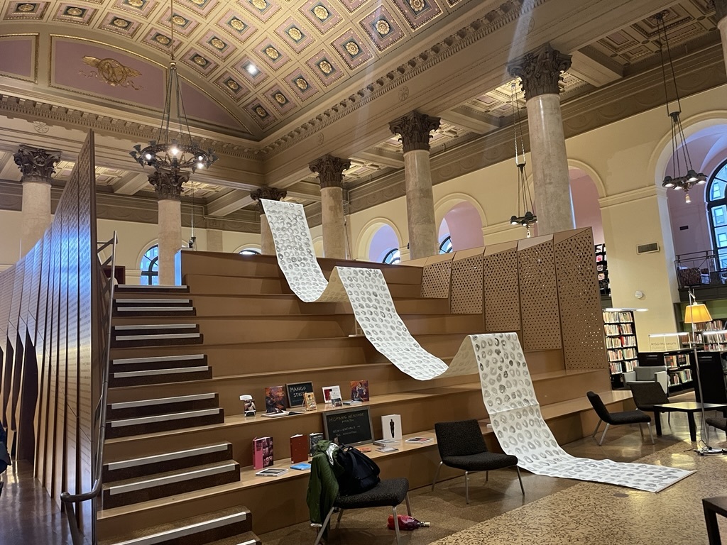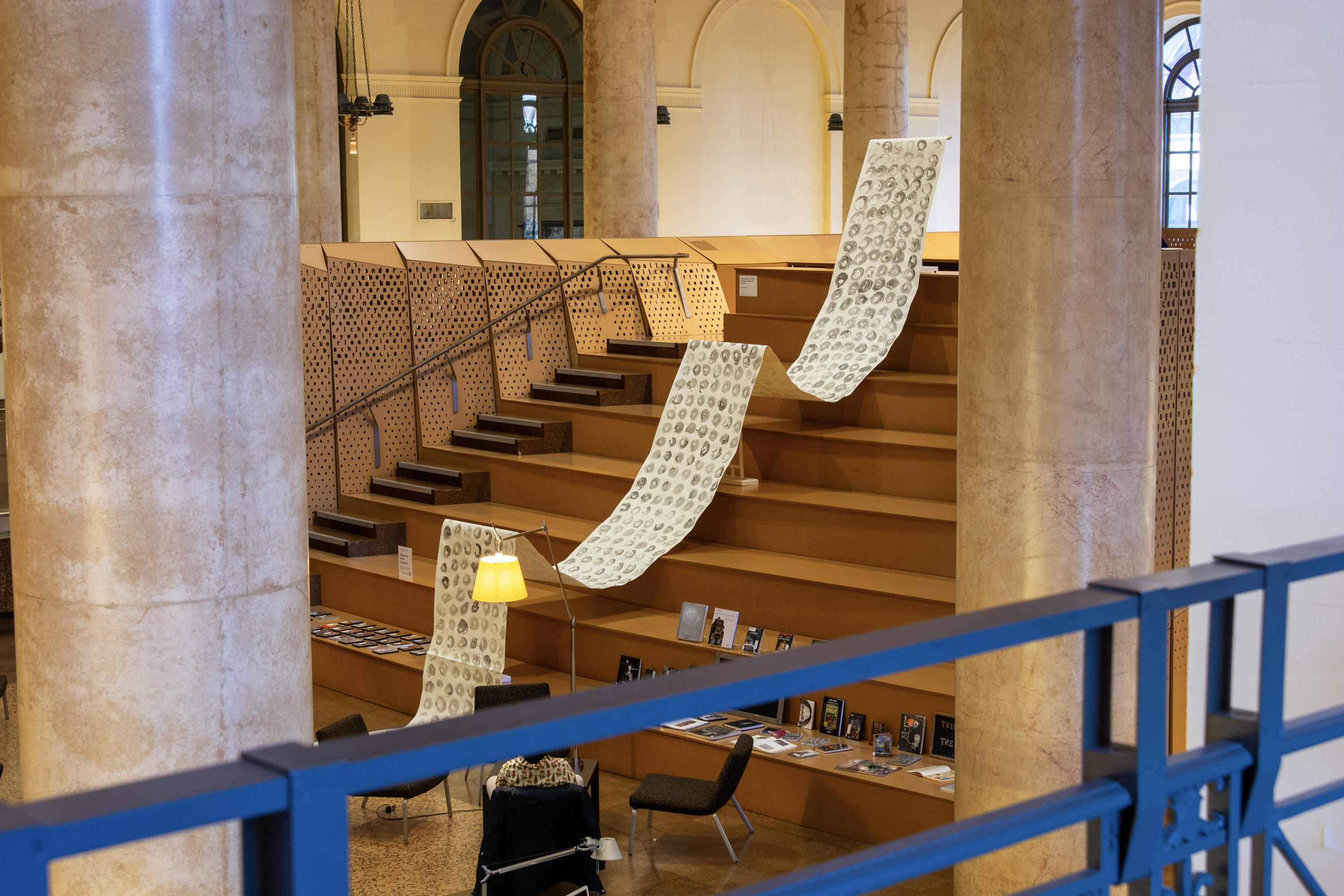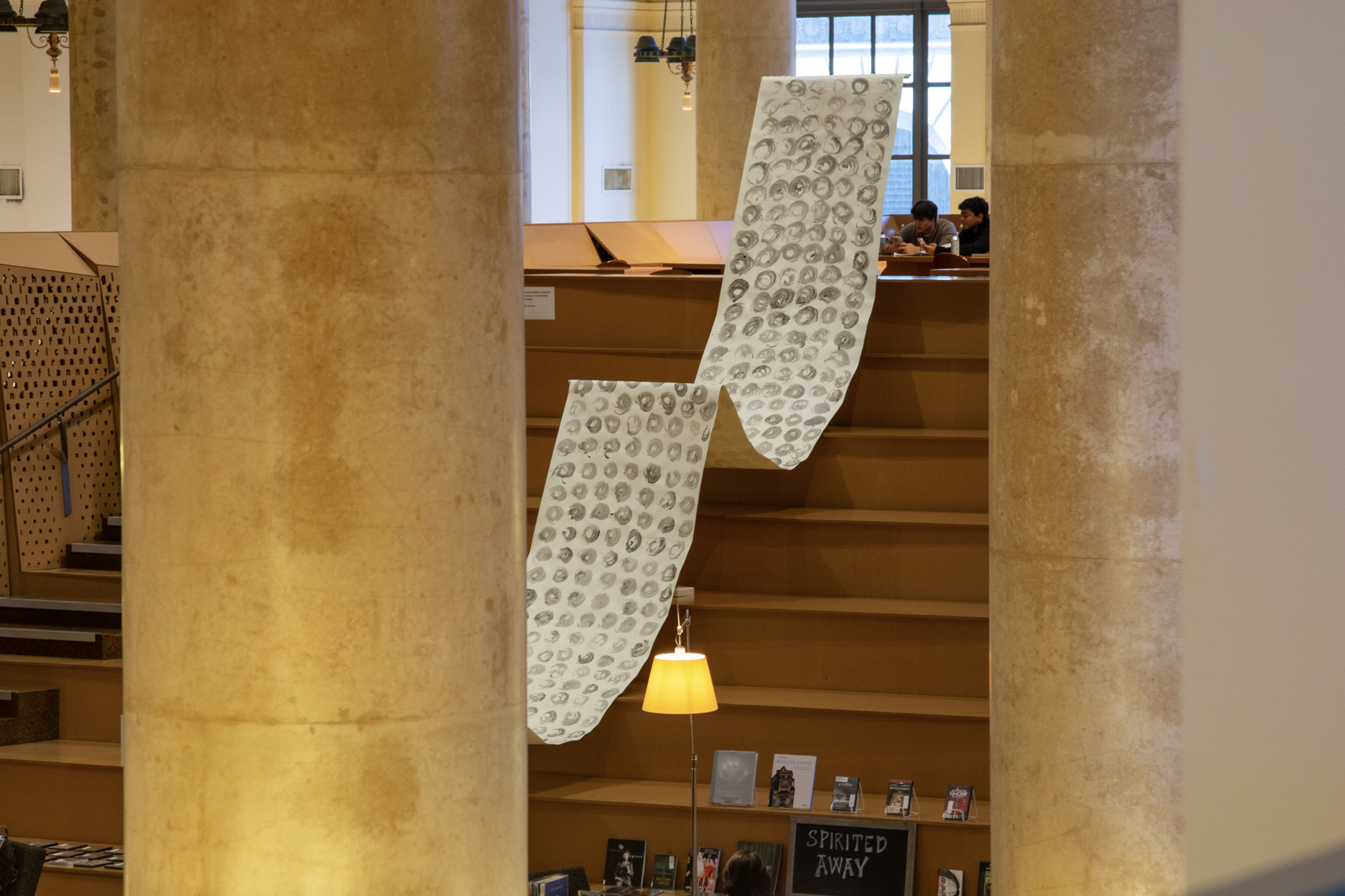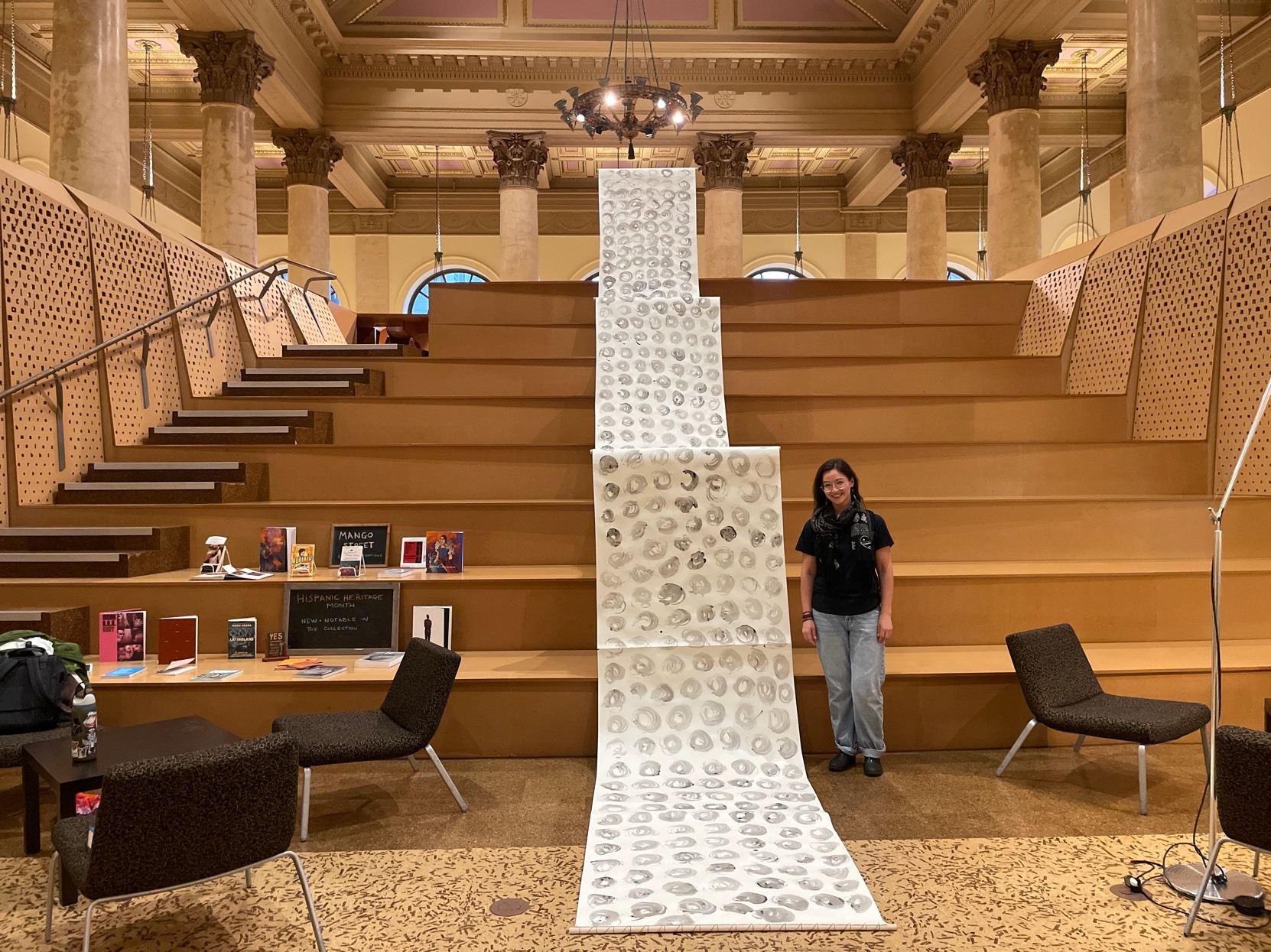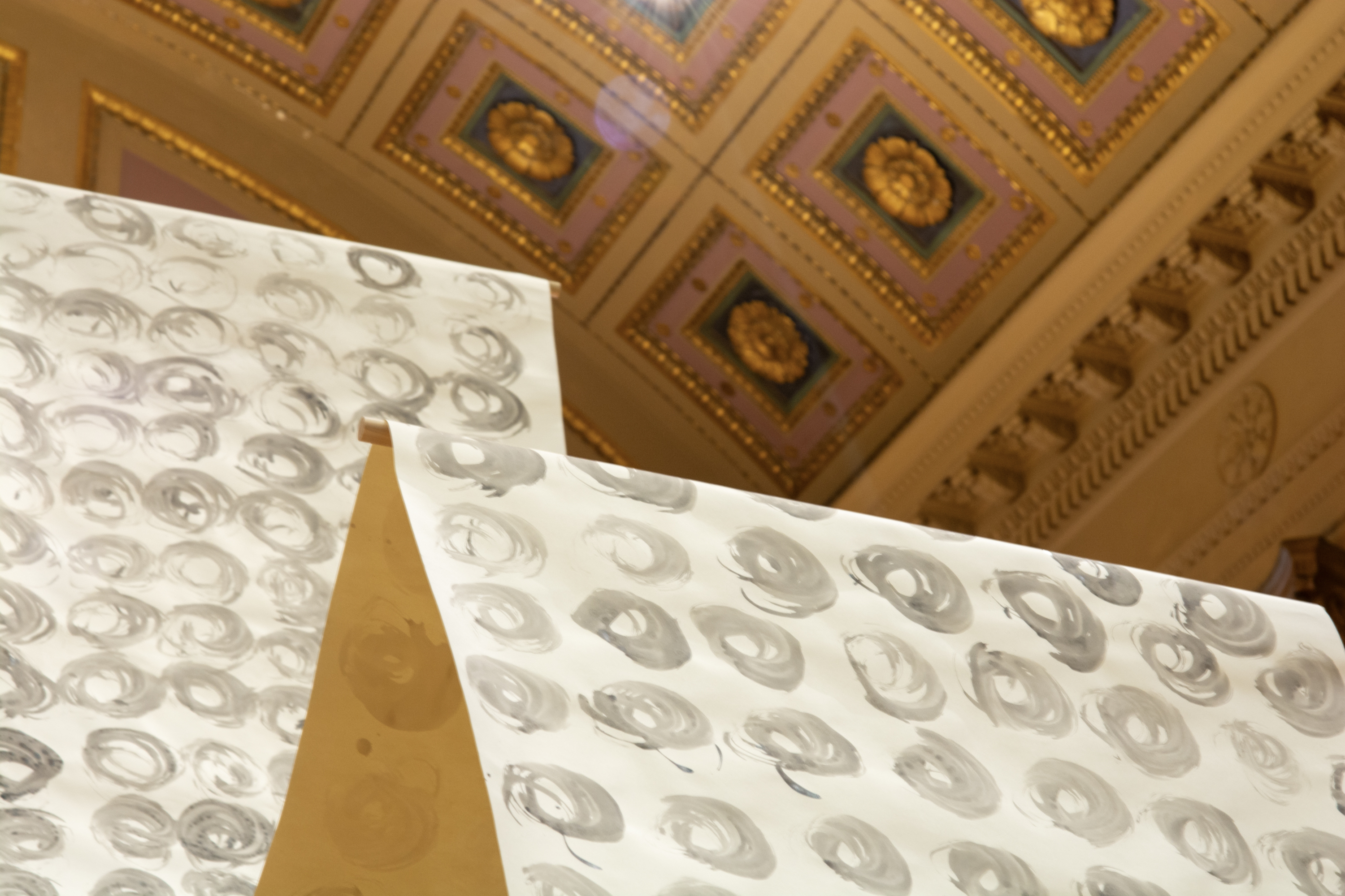 Installation by Abby Sunde MFA 26 GL, on view Oct. 8 - Oct. 17, 2025, Fleet Library 1st floor main reading room pavilion, 15 Westminster St., Providence, RI. Ink on paper and birchbark basket stitching on wood 42”x38’, 2025. With as much history that we know has occurred on Turtle Island since 1492, the heartaches, sorrows, and also the joy filled moments of community and resilience, so much of our history has gone untold or become forgotten. In considering the time since Columbus landed in the Bahamas and the accumulation of Indigenous histories that have gone untold since then, this piece seeks to visualize the lunar years and their passing seasons within that have occurred since 1492.