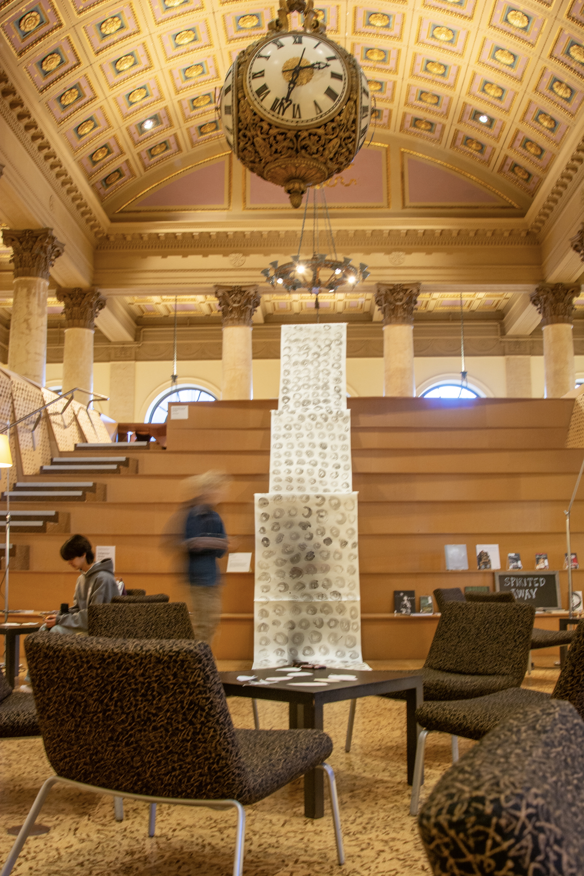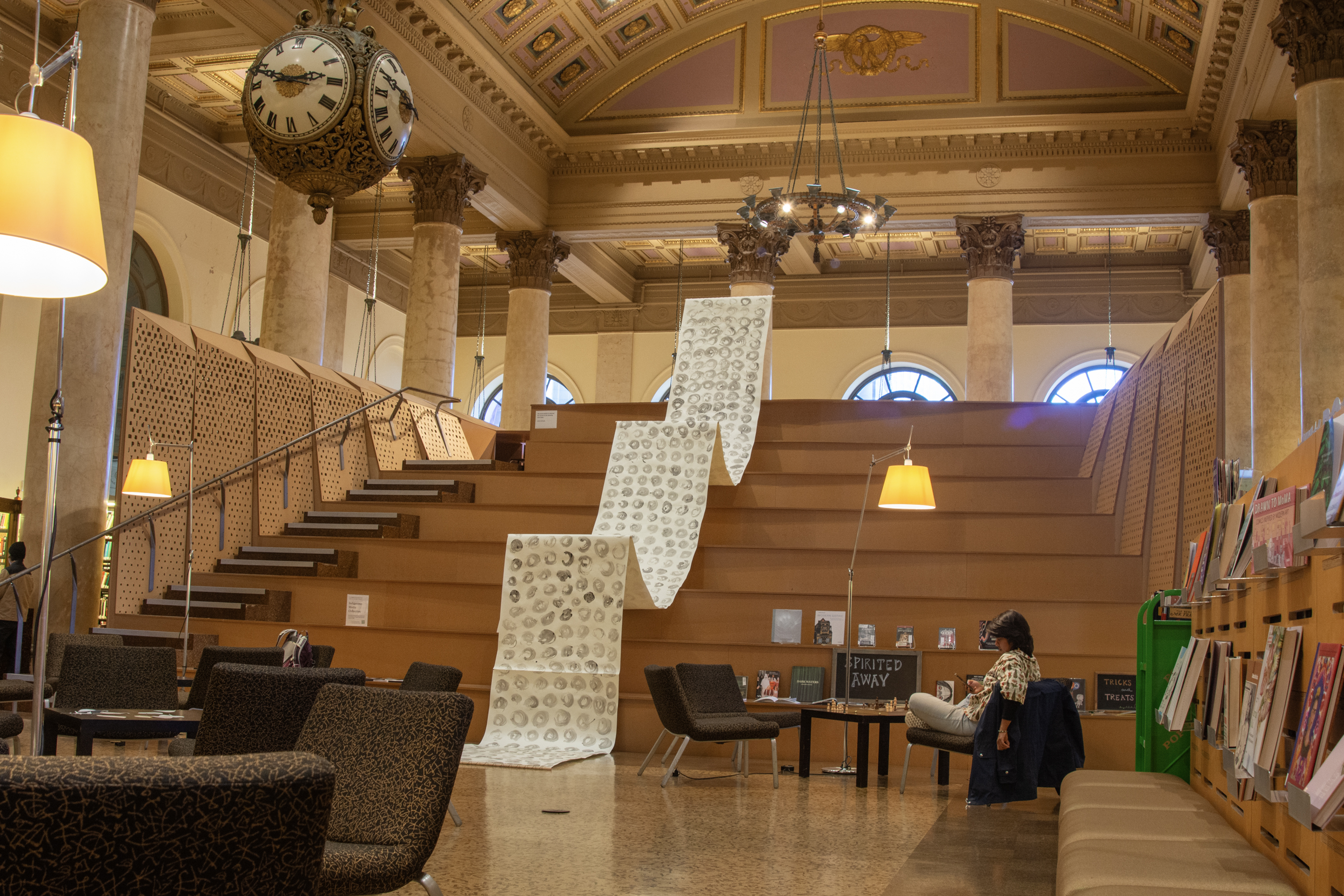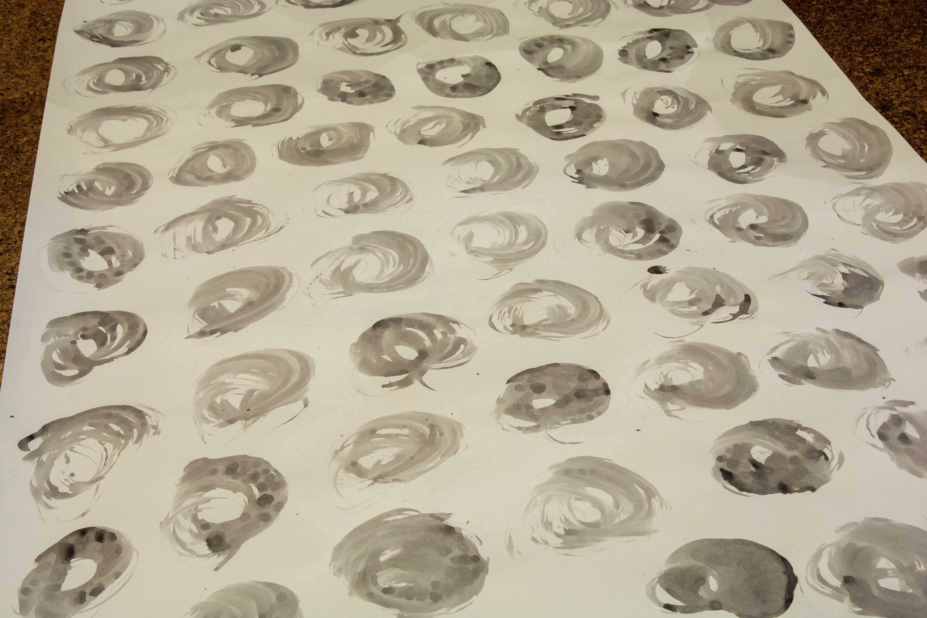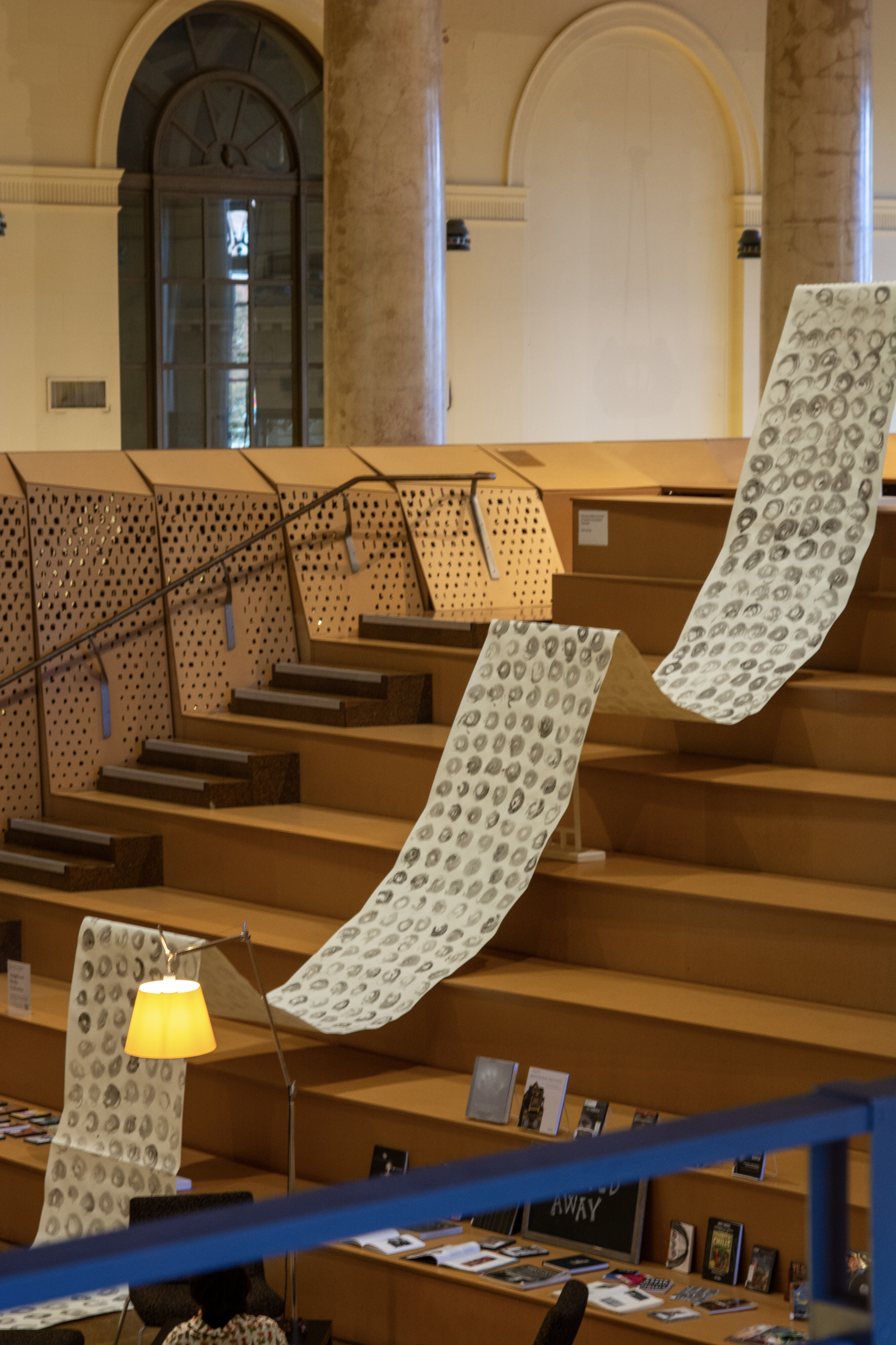 Installation by Abby Sunde MFA 26 GL, on view Oct. 8 - Oct. 17, 2025, Fleet Library 1st floor main reading room pavilion, 15 Westminster St., Providence, RI. Ink on paper and birchbark basket stitching on wood 42”x38’, 2025. With as much history that we know has occurred on Turtle Island since 1492, the heartaches, sorrows, and also the joy filled moments of community and resilience, so much of our history has gone untold or become forgotten. In considering the time since Columbus landed in the Bahamas and the accumulation of Indigenous histories that have gone untold since then, this piece seeks to visualize the lunar years and their passing seasons within that have occurred since 1492.