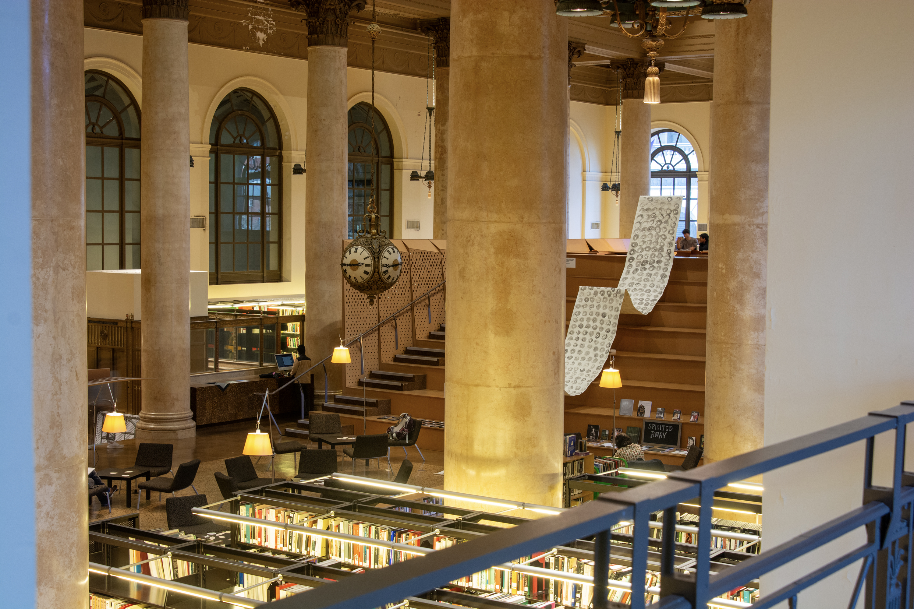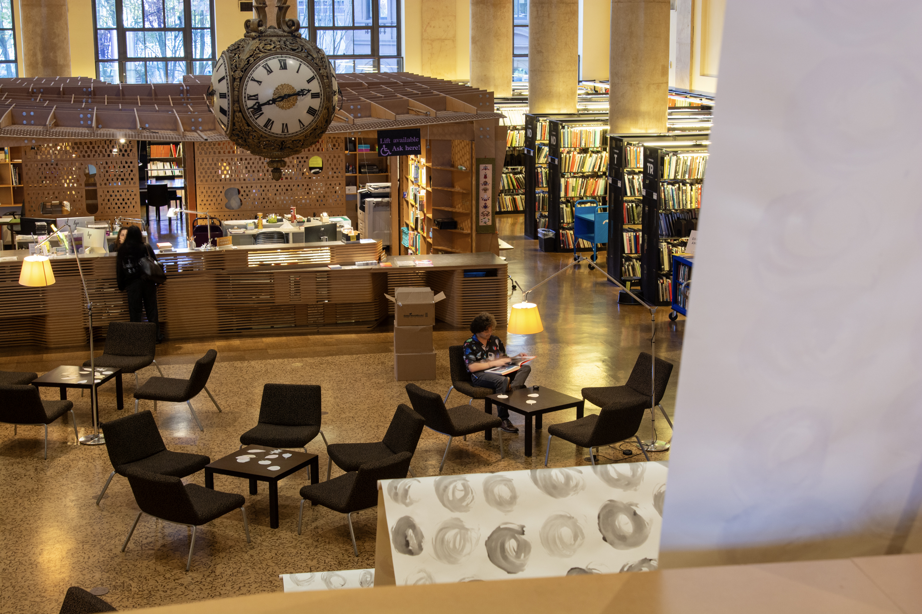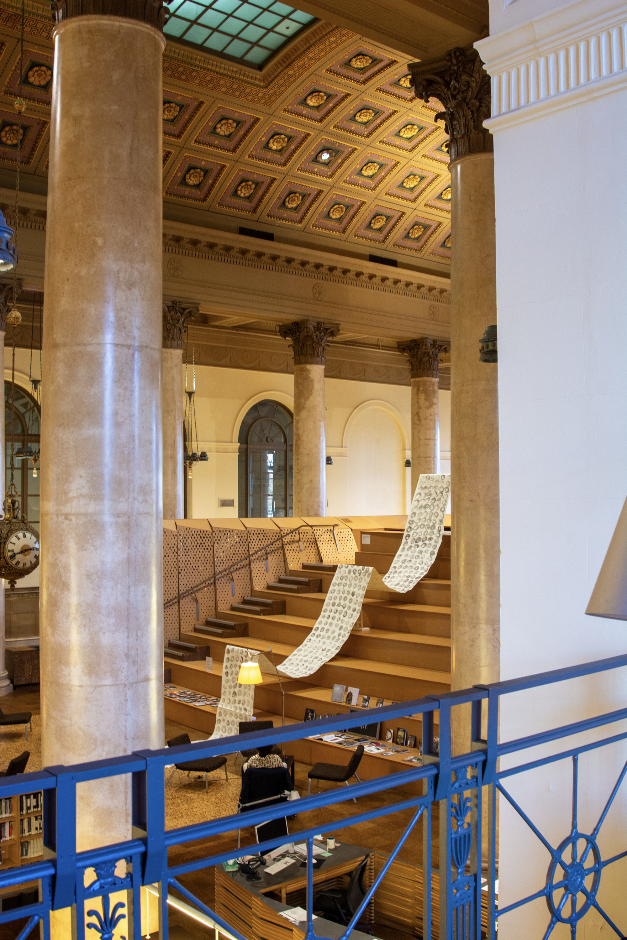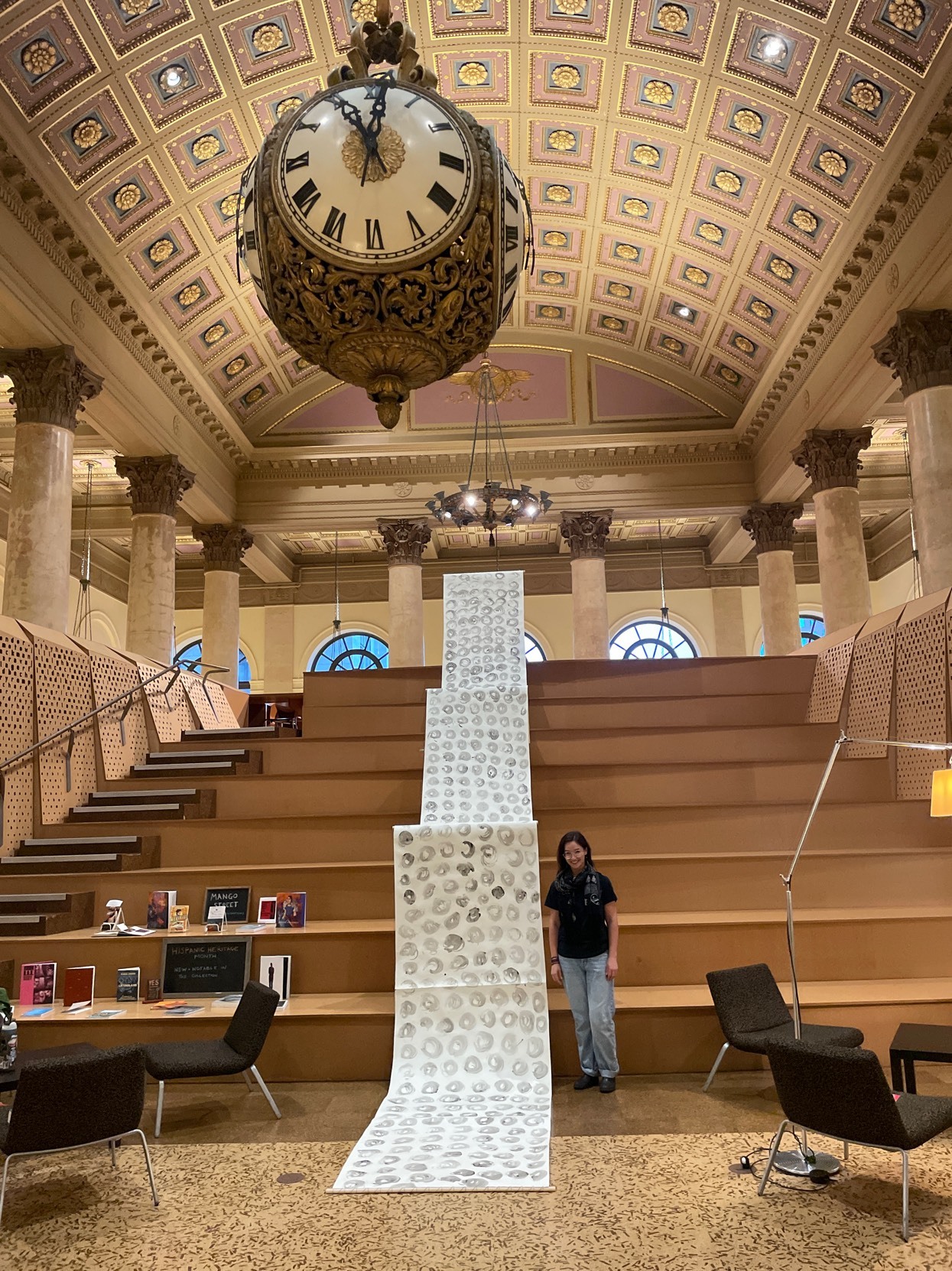 Installation by Abby Sunde MFA 26 GL, on view Oct. 8 - Oct. 17, 2025, Fleet Library 1st floor main reading room pavilion, 15 Westminster St., Providence, RI. Ink on paper and birchbark basket stitching on wood 42”x38’, 2025. With as much history that we know has occurred on Turtle Island since 1492, the heartaches, sorrows, and also the joy filled moments of community and resilience, so much of our history has gone untold or become forgotten. In considering the time since Columbus landed in the Bahamas and the accumulation of Indigenous histories that have gone untold since then, this piece seeks to visualize the lunar years and their passing seasons within that have occurred since 1492.