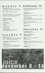 Juice was a short-form student publication primarily intended to publicize upcoming events occurring on or around campus. The November 8, 1993 issue highlights student exhibitions, visiting artist lectures, movie screenings, and conservation by design symposium events for the week of November 8-14.