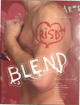 Blend-ACombinationofElements was a student magazine started by RISD student Dusty Brickman in 2003. The Fall 2003 issue is "The Passion Issue," and features articles on an exhibition with a custom installation by Sol LeWitt at the RISD Museum, the history of various buildings on the RISD campus, street graphics and urban art in Providence, luxury knitwear brand Lutz & Patmos, photographer Timothy White, deceased alum Jeffrey Michael Weiss, and the RISD Artist Ball.