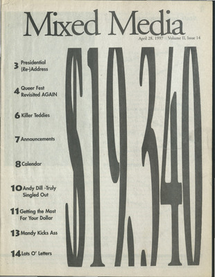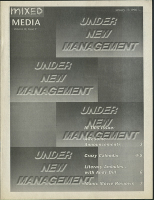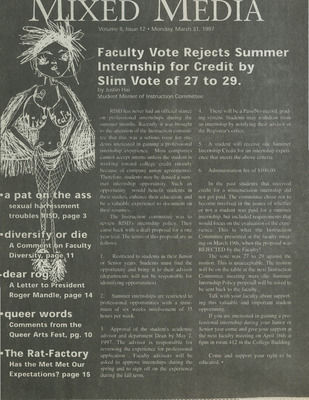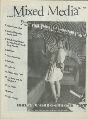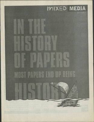 Mixed Media began as the student publication Your Name Here in the spring of 1996, published on a bi-weekly basis. After publishing two issues under that name, the students running the publication decided on Mixed Media. Topics covered include student artwork and photography, local and institutional news, editorials, comics, advertisements, and more. Higher resolution scans and the physical documents can be requested by contacting the Archives.