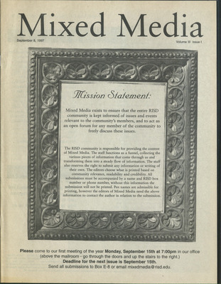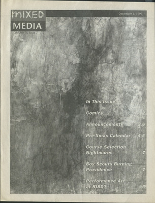 Mixed Media began as the student publication Your Name Here. The November 27, 2001 issue includes articles on Student Alliance updates, the end of programming at Carr House, community service opportunities at RISD, RISD life models, RISD Works, the drummer of band Live Jazz, a man who arranges rocks on Thayer Street, some RISD departments forcing students to buy laptops, and music and film reviews, along with the comics "Captain Obvious" and "Salsa! by Andrew Kaiko, event notices, and other announcements.