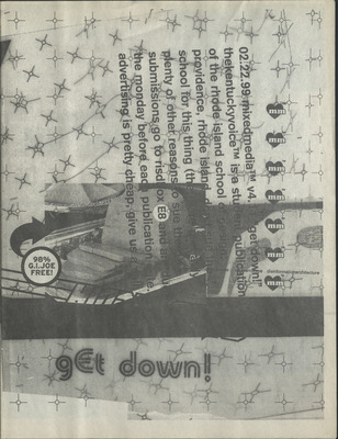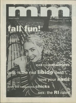 Mixed Media began as the student publication Your Name Here. The November 24, 2002 issue includes articles on a student's experience creating digital art, interviews with RISD and Brown students, a volunteering experience at a preschool in Brooklyn, community service opportunities, the lack of scary villains in contemporary children's films, film and music reviews, along with the comic "Juan Two Three" by Juan Diaz, "Speed Limit 666" by Paolo Rivera, "Idle/" by R. Kikuo Johnson, "Atlas and the Beast from Time Forgotten," "Cottontail" by Jen Rolfsema, "Bass Turds" by Adam Sacks, "Stuff of Dreams" by Andrew Kaiko, advice columns, event notices, and other announcements.
