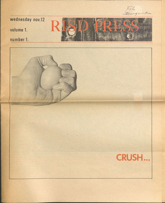 RISD press was a student newspaper published weekly in the early 1970s, a self-described attempt at consolidating into one digestible pile all the information outlets of the school, including the previous student newspaper, Montage. Contents include student artwork and photography, local and institutional news, editorials, comics, advertisements, and more. Beginning in September 1973, RISD press included the Brown Daily Herald’s weekly issue of Fresh Fruit as an insert. This has been included in the scans appended to the end of each issue of RISD press where appropriate. Higher resolution scans and the physical documents can be requested by contacting the Archives.