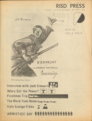 RISD press was a student newspaper published weekly in the early 1970s, a self-described attempt at consolidating all the information outlets of the school, including the previous student newspapers, Montage. The issue of November 12, 1976 includes articles on RISD Provost Jack Stewart, the Nads, a freshman field trip to Boston, conflicts between students and the administration, the European Honors Program, Armistice Day, sculptor Italo Scanga, the painting club, a student board meeting, along with the "Tell It to the Tipster" column, event notices, and other announcements.