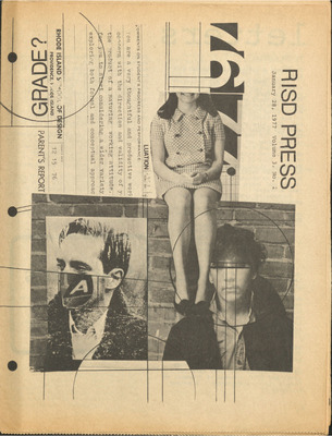 RISD press was a student newspaper published weekly in the early 1970s, a self-described attempt at consolidating all the information outlets of the school, including the previous student newspapers, Montage. The issue of January 28, 1976 features an Illustration Review and also includes articles on faculty voting to restore the letter grading and GPA system at RISD, editorials and letters to the editor, event notices, and student board minutes.
