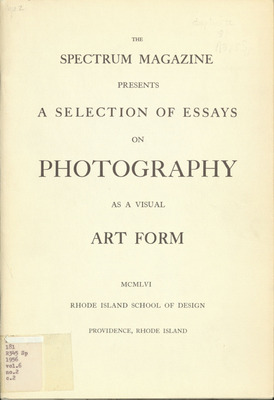 Spectrum was a publication released in the early 1950s by the undergraduate students at Rhode Island School of Design. This issue from May 1956 features essays written by professional photographers on the theme of "photography as a visual art form." Guest essayists include Lyle Mayer, Beaumont Newhall, Jacob Deschin, Barbara Morgan, and Aaron Siskind. Two RISD students, Emilio Grossi and Ronald Binks also contribute. This issue additionally includes photographic plates by Lyle Mayer, Ronald Binks, Aaron Siskind, Howard Dearstyne, Emilio Grossi, Edward Weston, and Minor White.