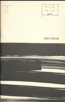 Spectrum was a publication released in the early 1950s by the undergraduate students at Rhode Island School of Design. This issue from 1959 is formatted as a portfolio, with student and faculty artwork and creative writing, along with personal essays and essays that examine theories on art and artists. Likely published in April. Contributors include Bruce Berthiaume, Phelps, Hibbard, William Ouellette, M. Illenberger, Robert Cronin, T. Ryan, Cardenas, and Turner Johnson.