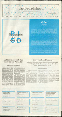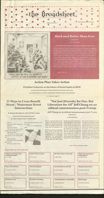 The Broadsheet was a short-lived student newspaper published in 2017. The May 6, 2017 issue was the first and contained articles on the Social Equity Action plan developed in the wake of the "Not Your Token" protests, random facts about RISD, Project Open Door (POD), faculty member Jung Joon Lee, previous student newspapers from the RISD Archives, the European Honors Program, facts about the RISD student body, a student music club on campus, how Mike Fink saved Carr Haus, and other items of interest.