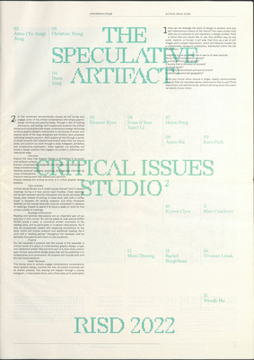 The Speculative Artifact was a student publication created for the Graphic Design seminar/studio Critical Issues Studio, taught by Anther Kiley in Fall 2022. The publication features designs and concepts for artifacts of the future created by students. Artifacts include language aids, a sex worker kit, food packaging, a garden pack, style-transferred furniture, a post-taste apartment, a maze sculpture, a personality magazine, animal-human cohabitation, signage, a friend-dating system, coding tech, a transhuman sticker book, and television programming with animal languages